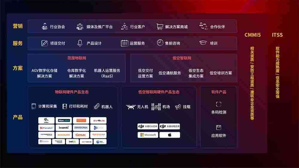 聚合国内外先进的物联网硬件产品品牌,,,聚焦数字化仓储、、机器人运营、、、低空智联网等领域,,,,共同打造适合客户业务场景的解决方案并提供交付服务